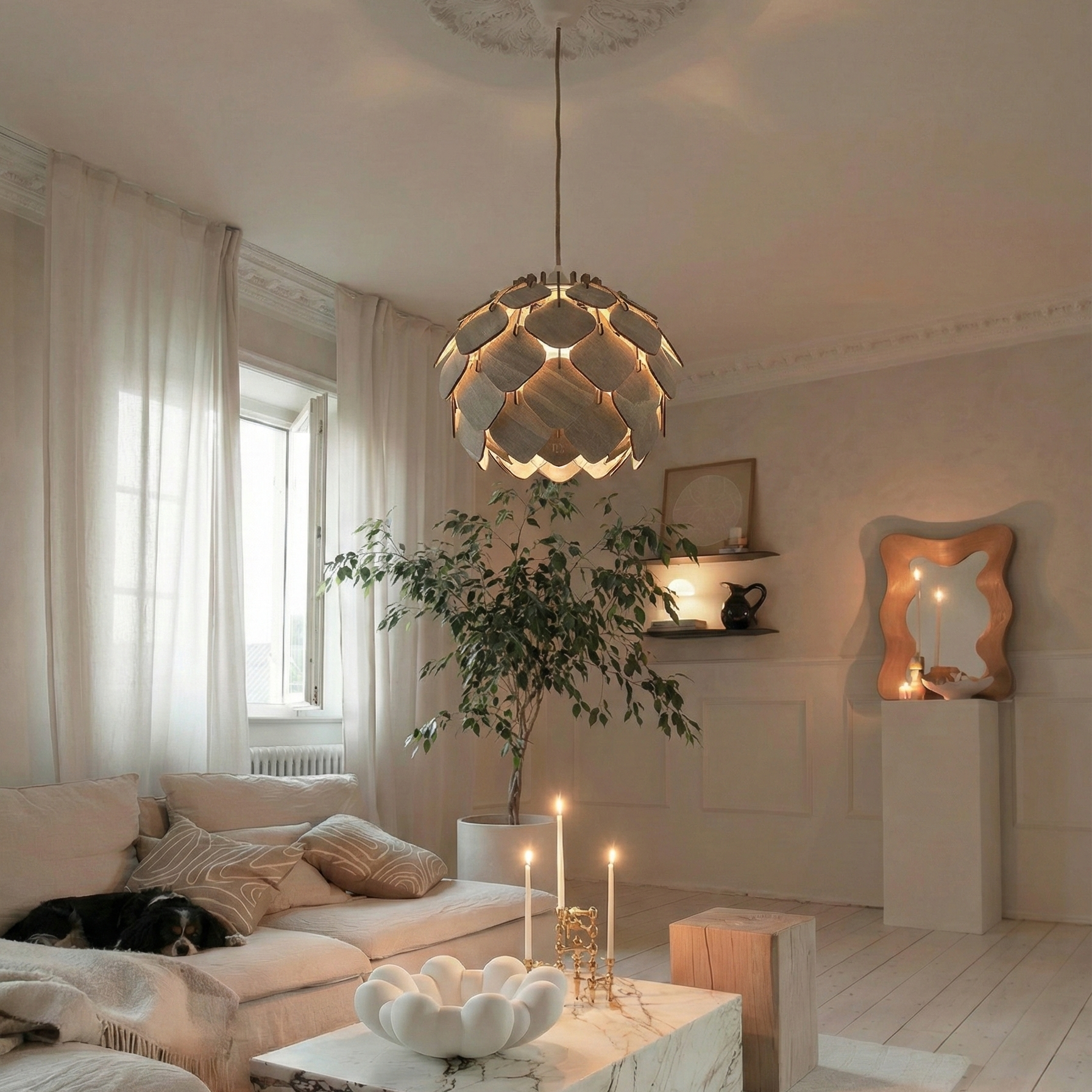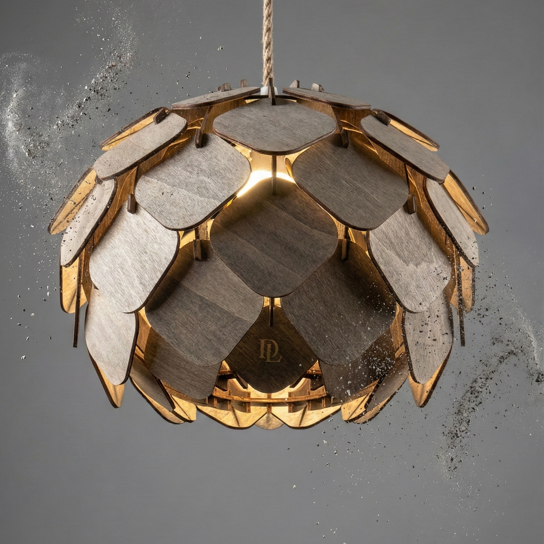 När Aska tänds fylls rummet av ett mjukt, varmt sken där ljuset filtreras genom träets djupa askton och skapar en lugn, inbjudande atmosfär.